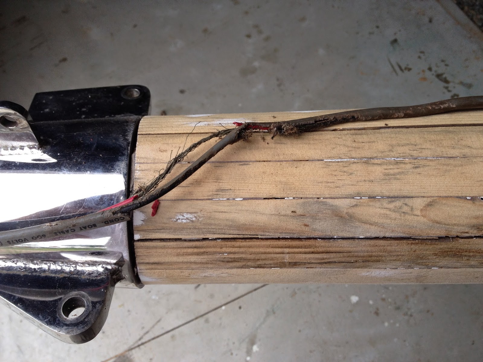 Some of the seams need attention too so Plan D is probably to remove sections of a stave (or staves) and rout out any more crap in the mast, I will remove the wires as well. I was going to replace the wires anyway, but there is no question now. For reasons that defy logic, critters like to gnaw on wires (see photo) and these appear to have been the central dish at their thanksgiving day feast.